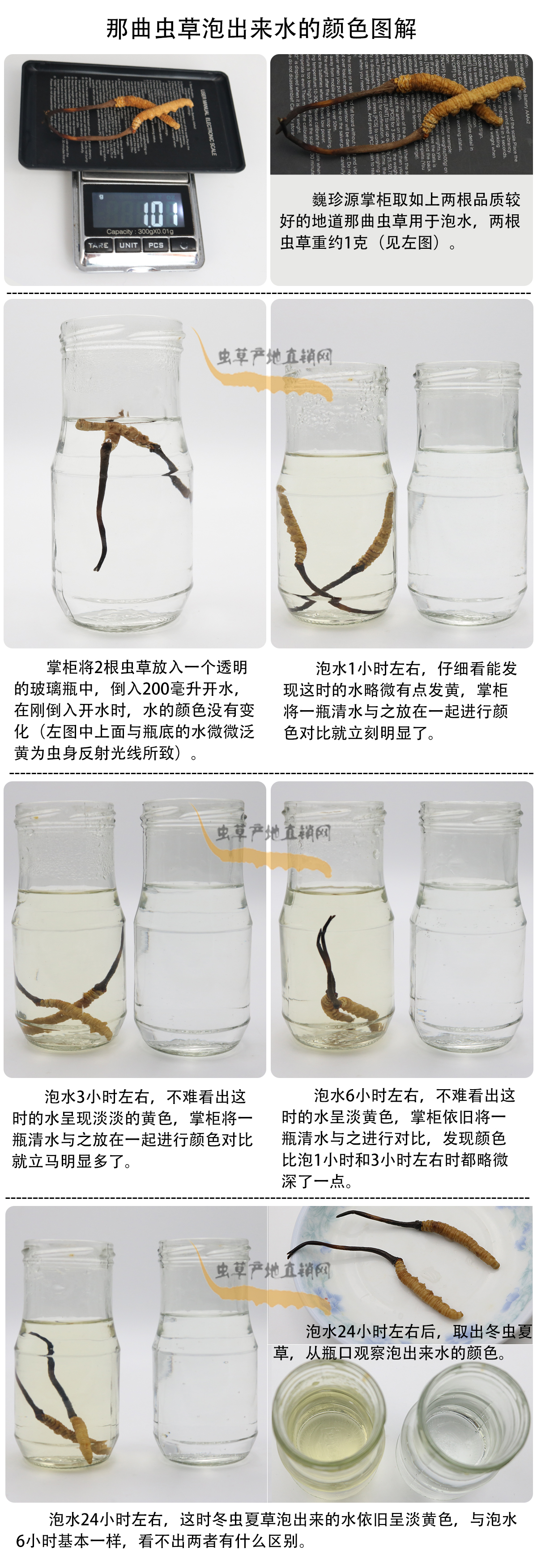 冬虫夏草泡水是最常用的服用方法,有些细心的顾客在冬虫夏草泡水过程中观察水的颜色变化,并向我们提出了一些疑问。为了掌握第一手资料,更客观准确的回答大家的疑问,巍珍源掌柜亲自试验冬虫夏草泡水过程(以那曲冬虫夏草作为试验样本),并拍下水的颜色变化照片,请大家先看照片,然后巍珍源掌柜再就几个重要问题进行解答,照片如下: